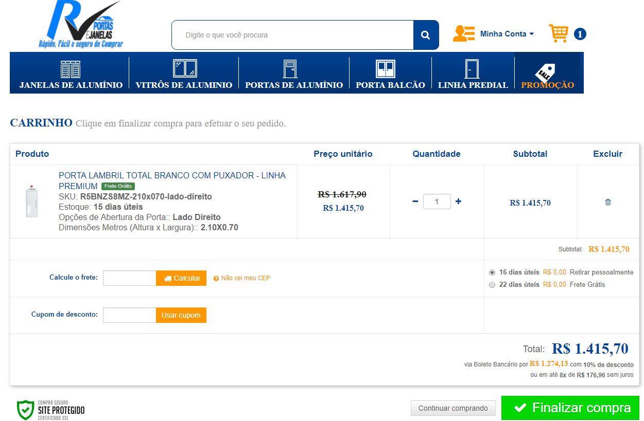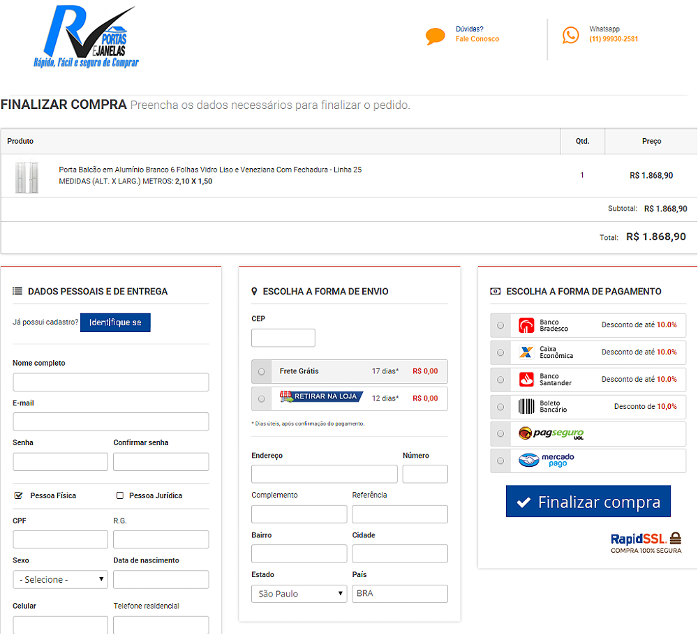 Na mesma tela, é só escolher a forma de envio e pagamento. Clique em finalizar a compra.